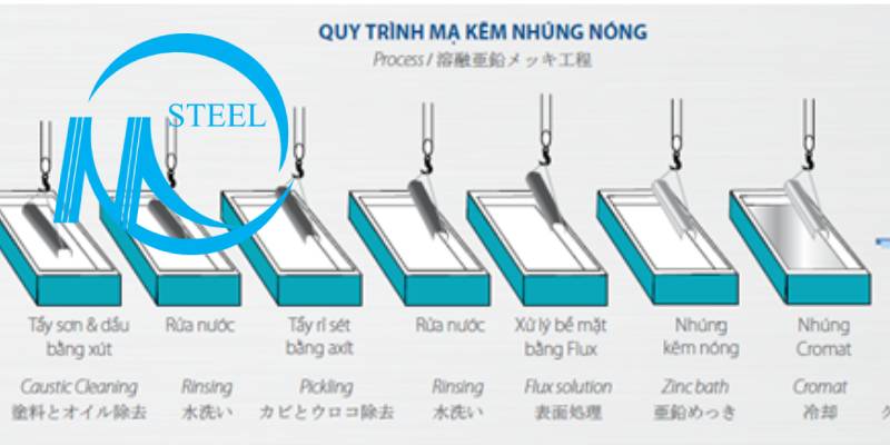 2. Nhúng vào kẽm nóng chảy: Thép sau khi làm sạch được nhúng vào bồn chứa kẽm nóng chảy ở nhiệt độ khoảng 450°C.